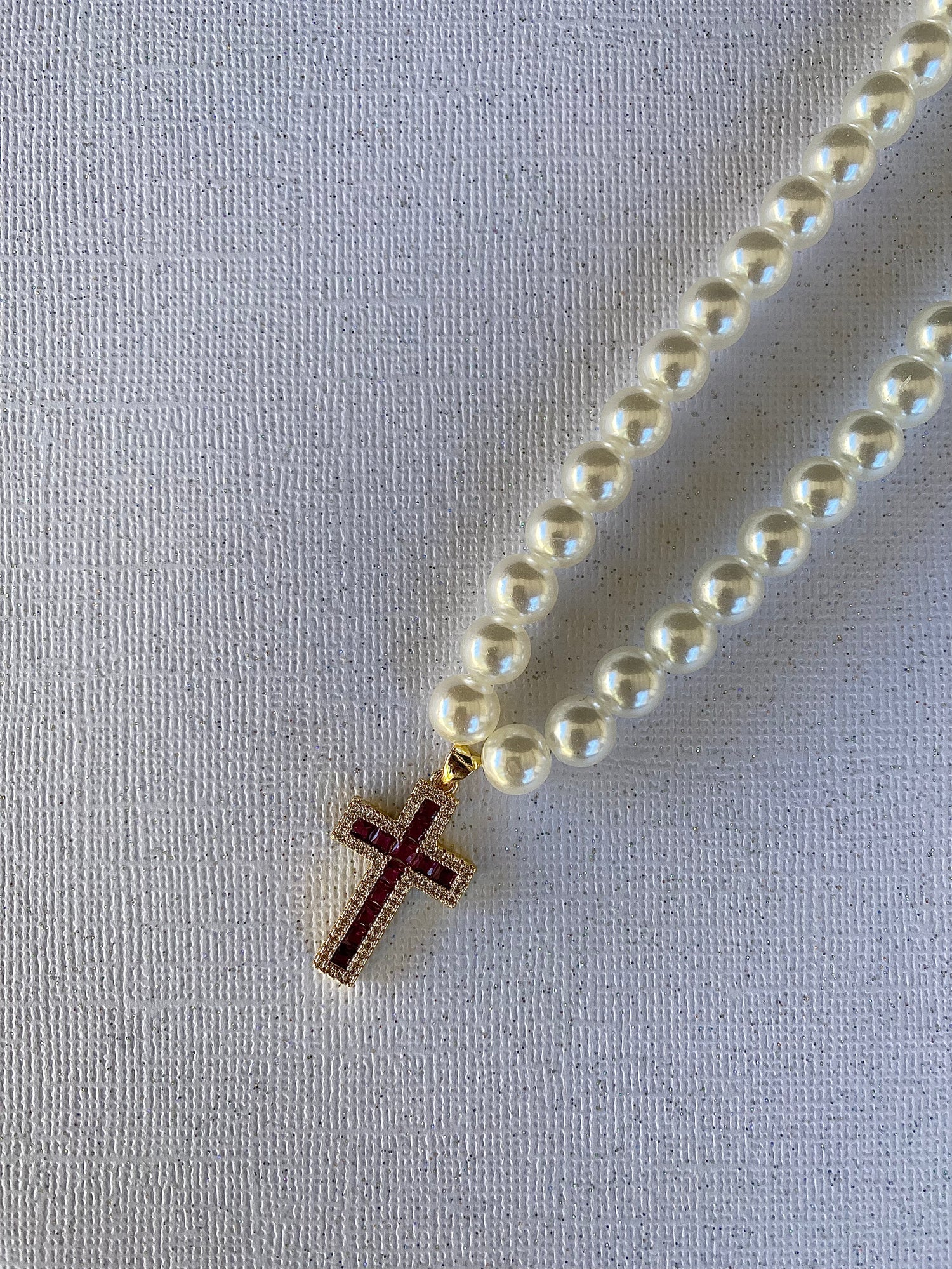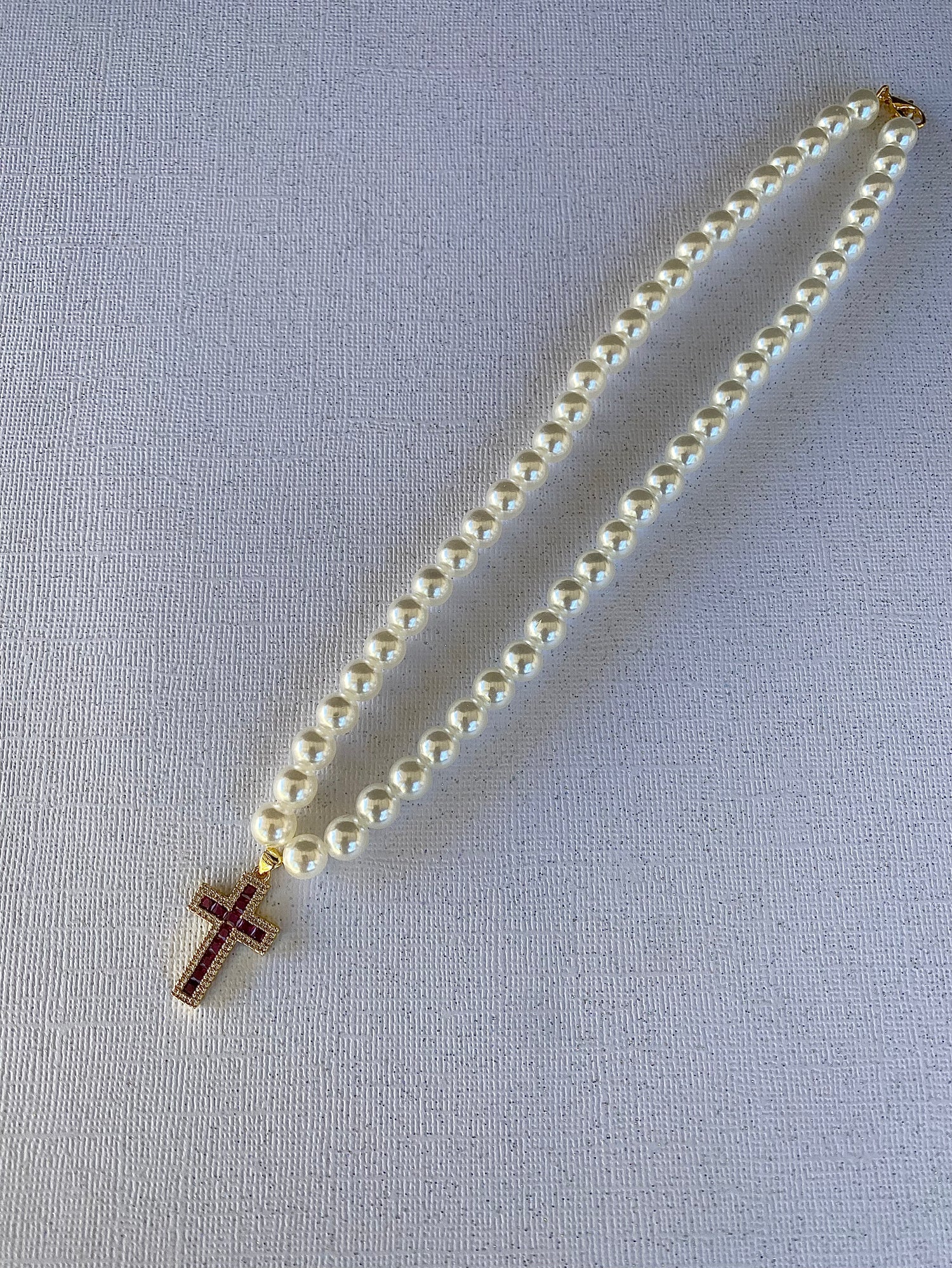 8mm faux pearls with gold, pink CZ cross pendant. 18 inches long.