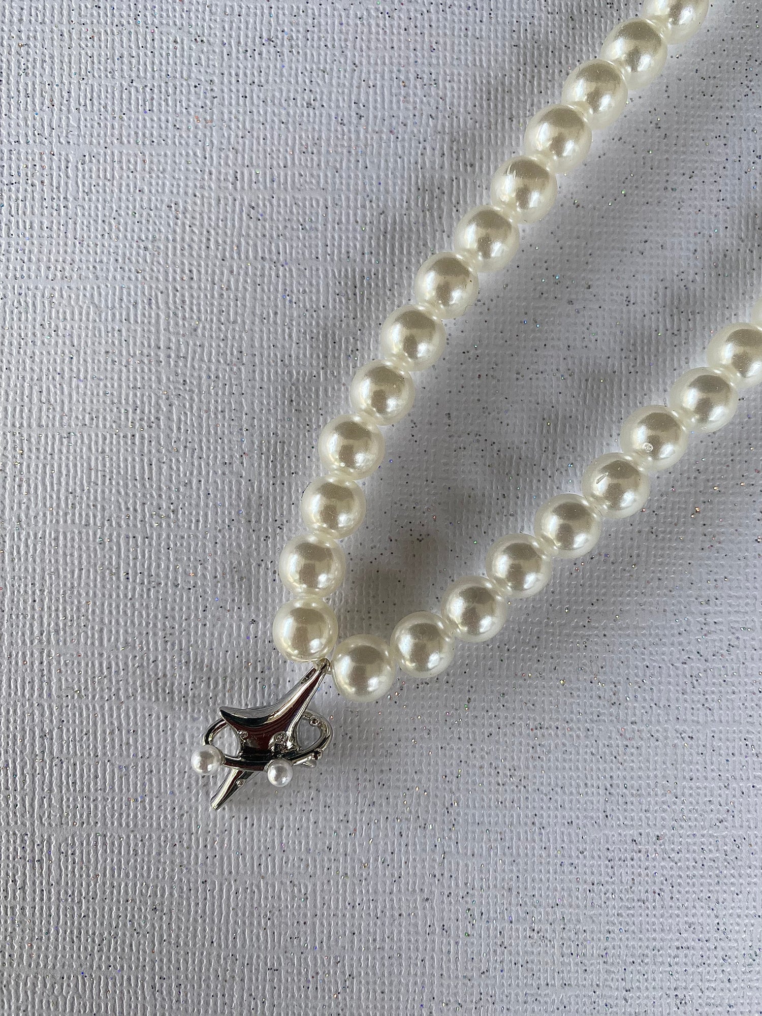 8mm faux pearls with silver pendant. 18 inches long.