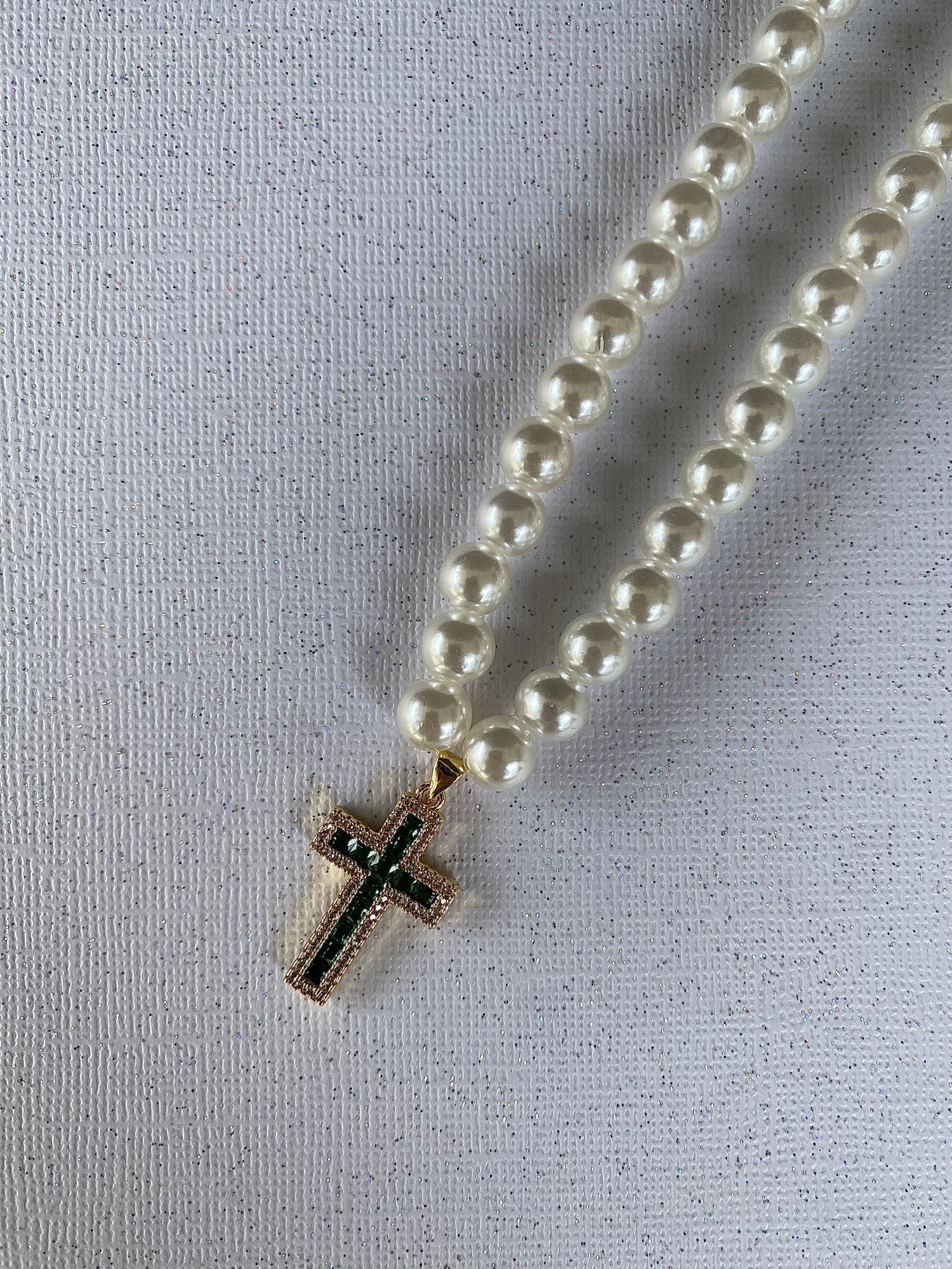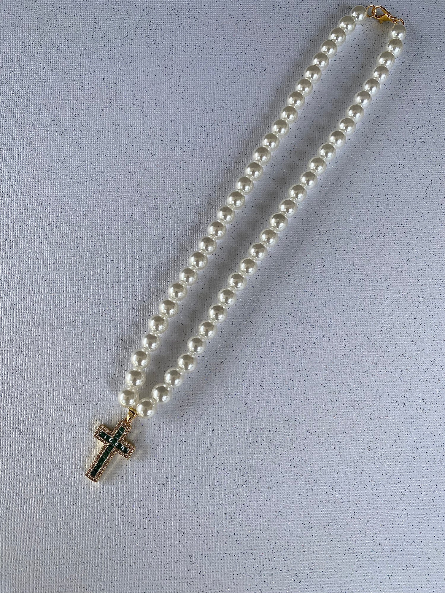 8mm faux pearls with gold, emerald CZ cross pendant. 18 inches long.