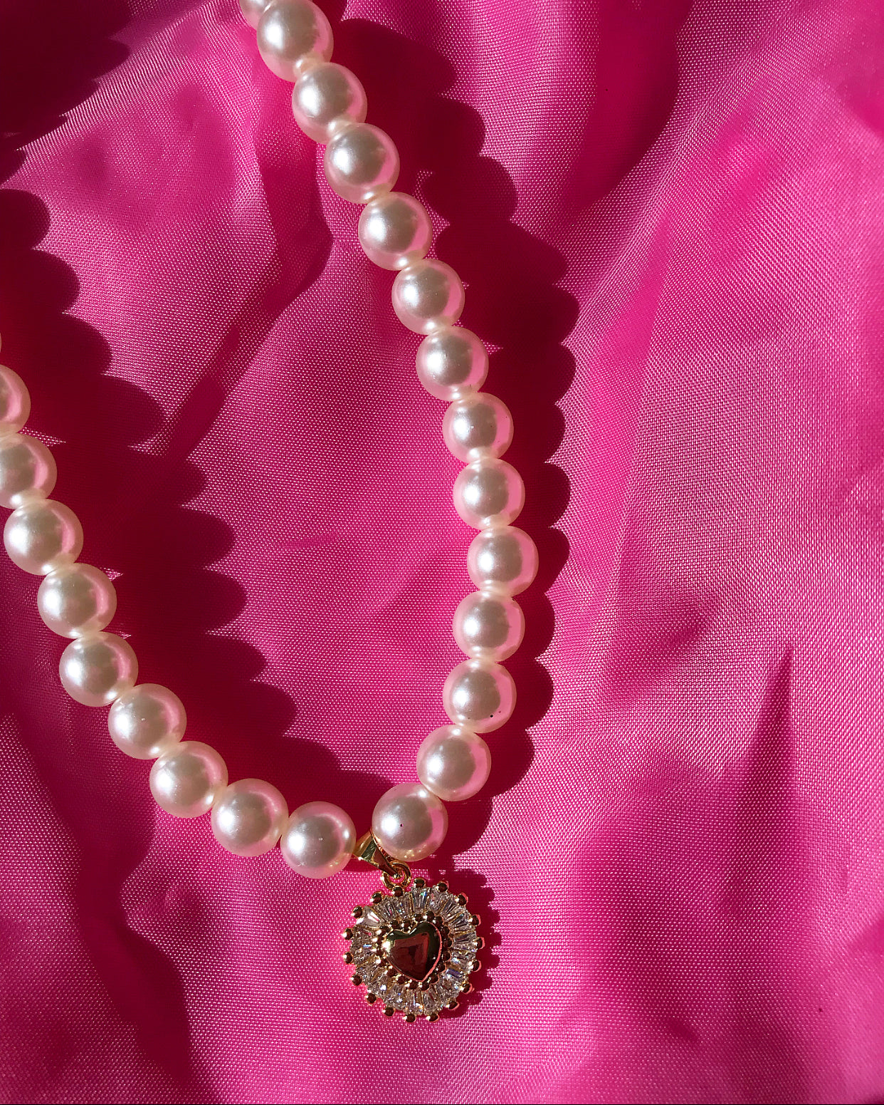 High quality faux pearl necklace with gold CZ heart detail.
