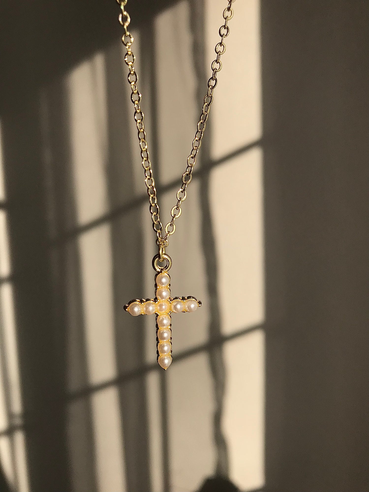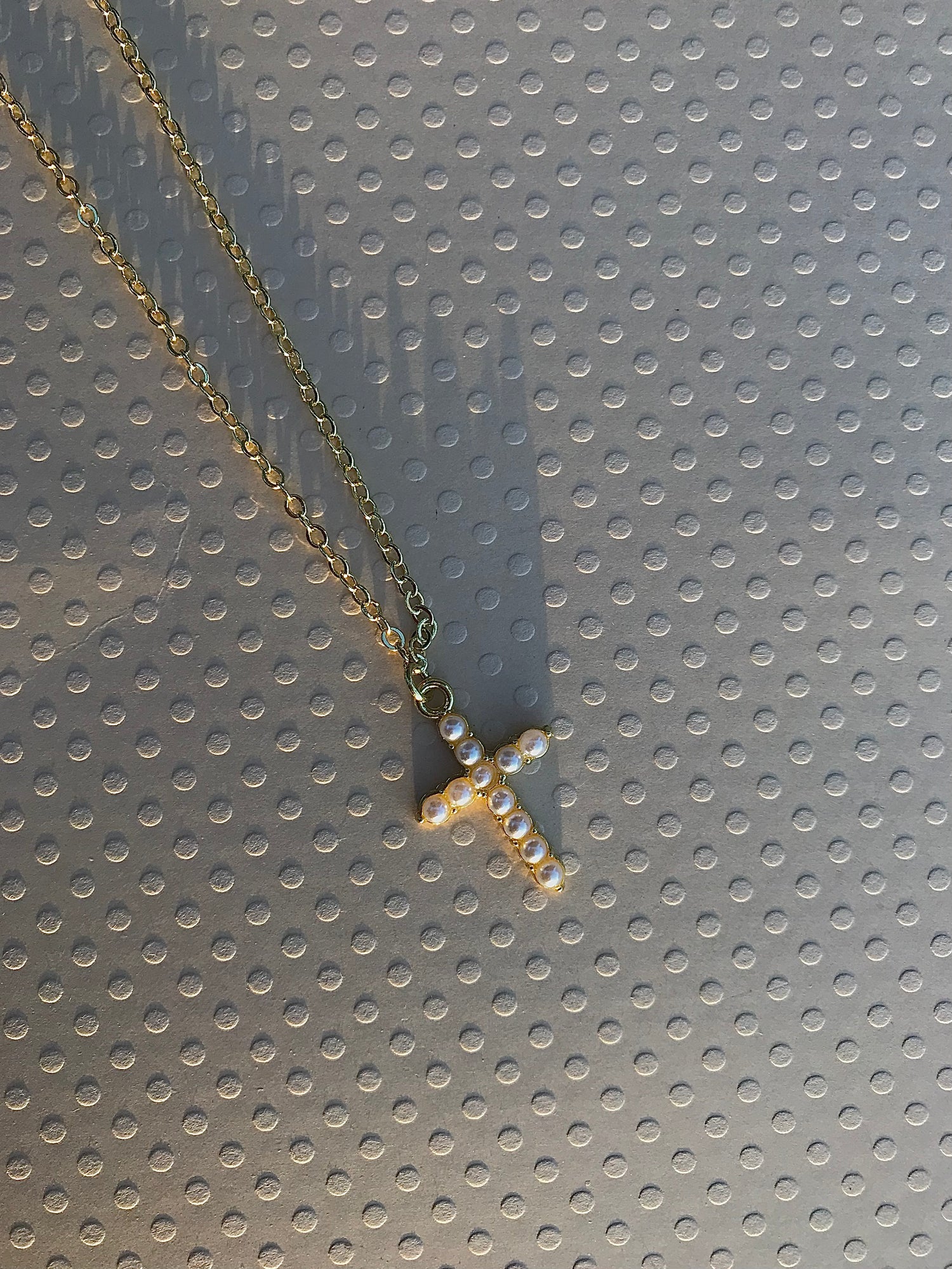 Dainty 14k gold plated chain with gold plated pearl cross pendant.