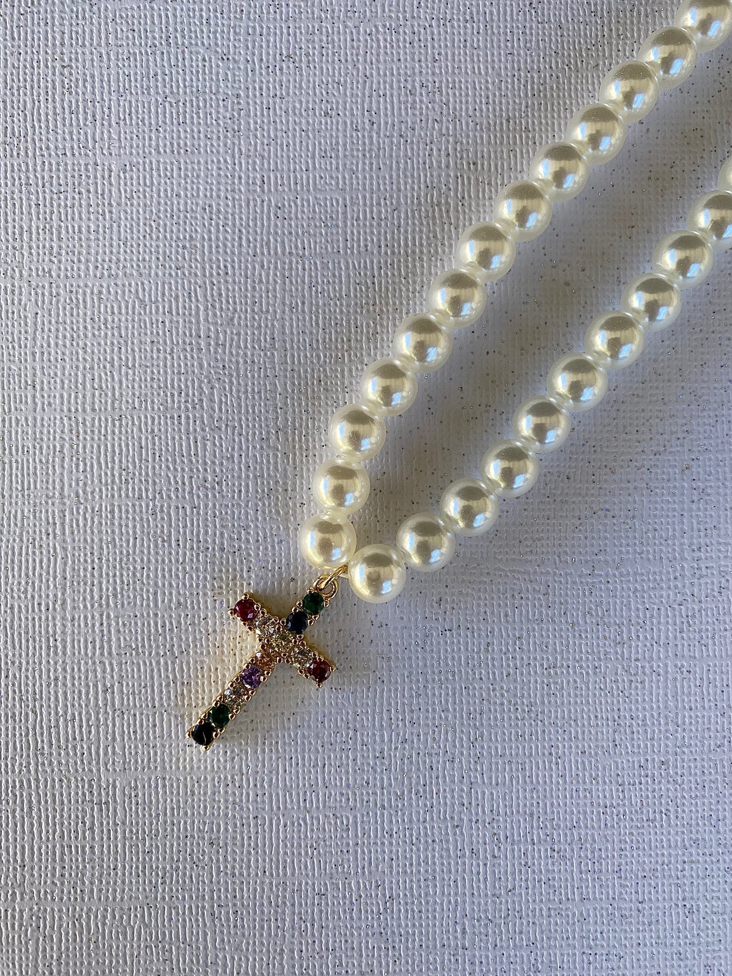 8mm faux pearls with gold, colorful CZ cross pendant. 18 inches long.