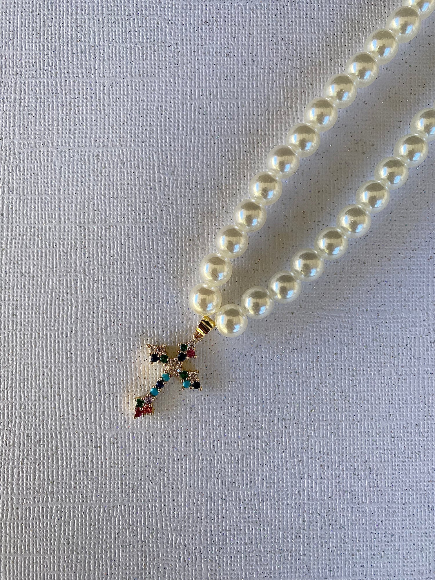 8mm faux pearls with gold, colorful CZ cross pendant. 18 inches long.