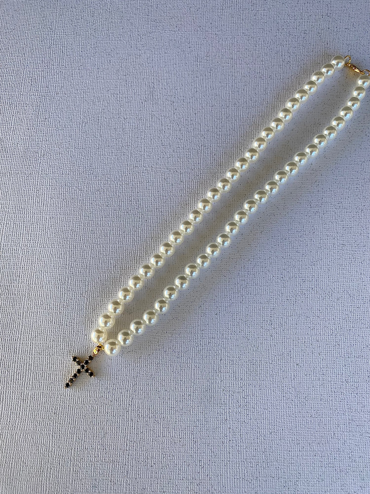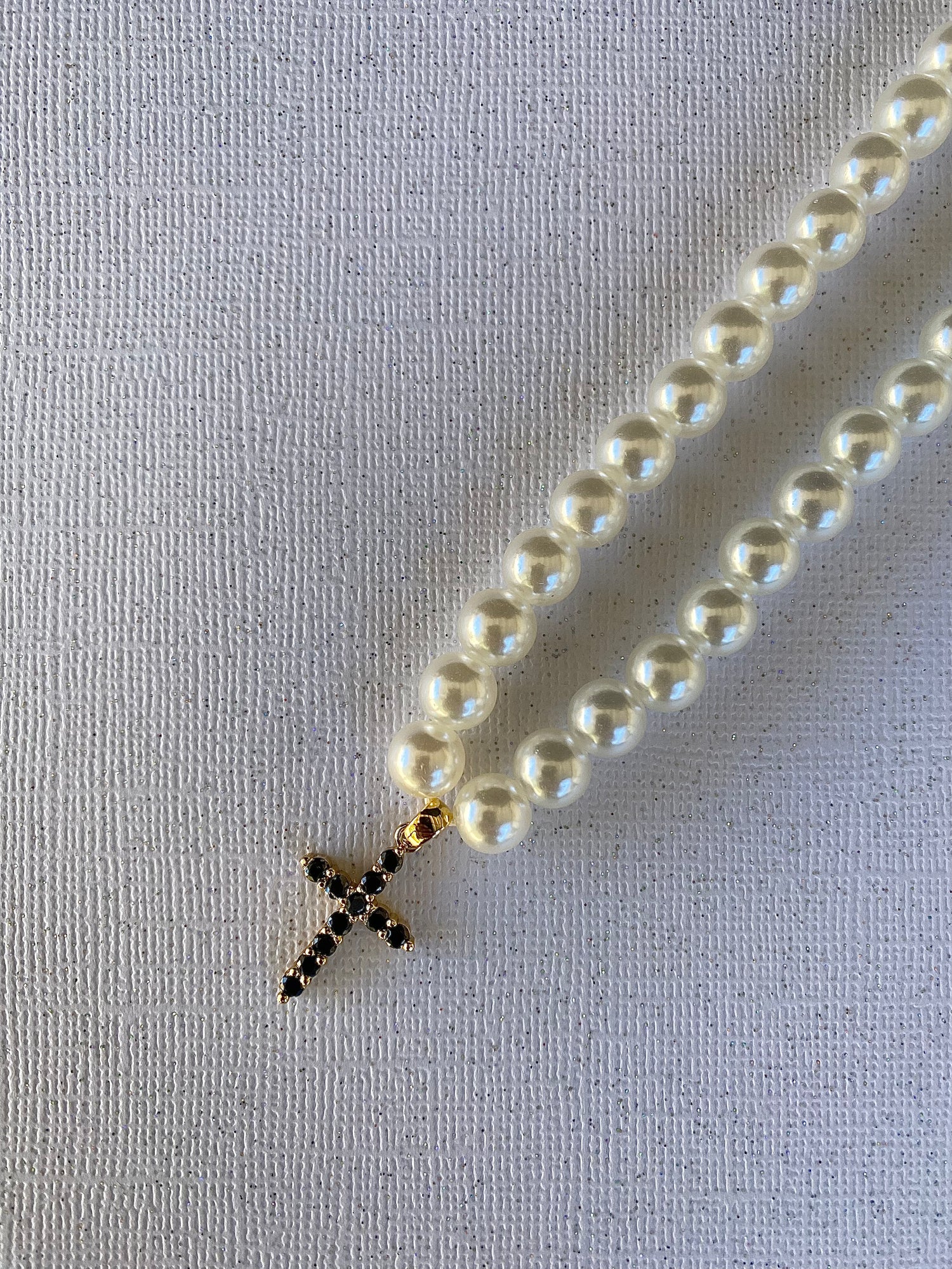 8mm faux pearls with gold, black CZ cross. 18 inches long.