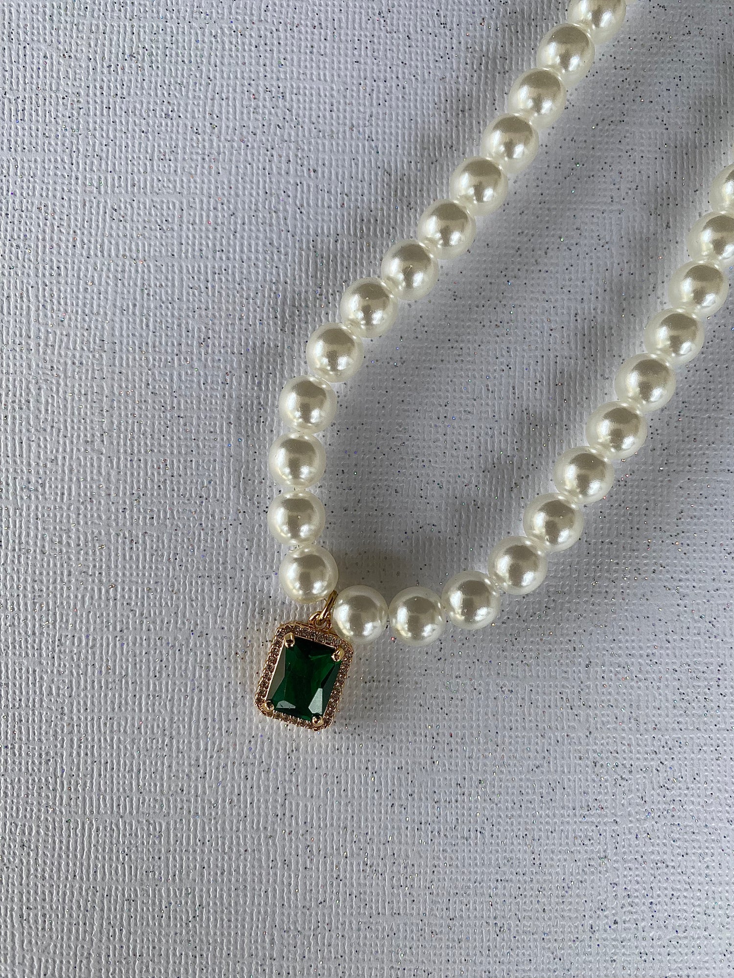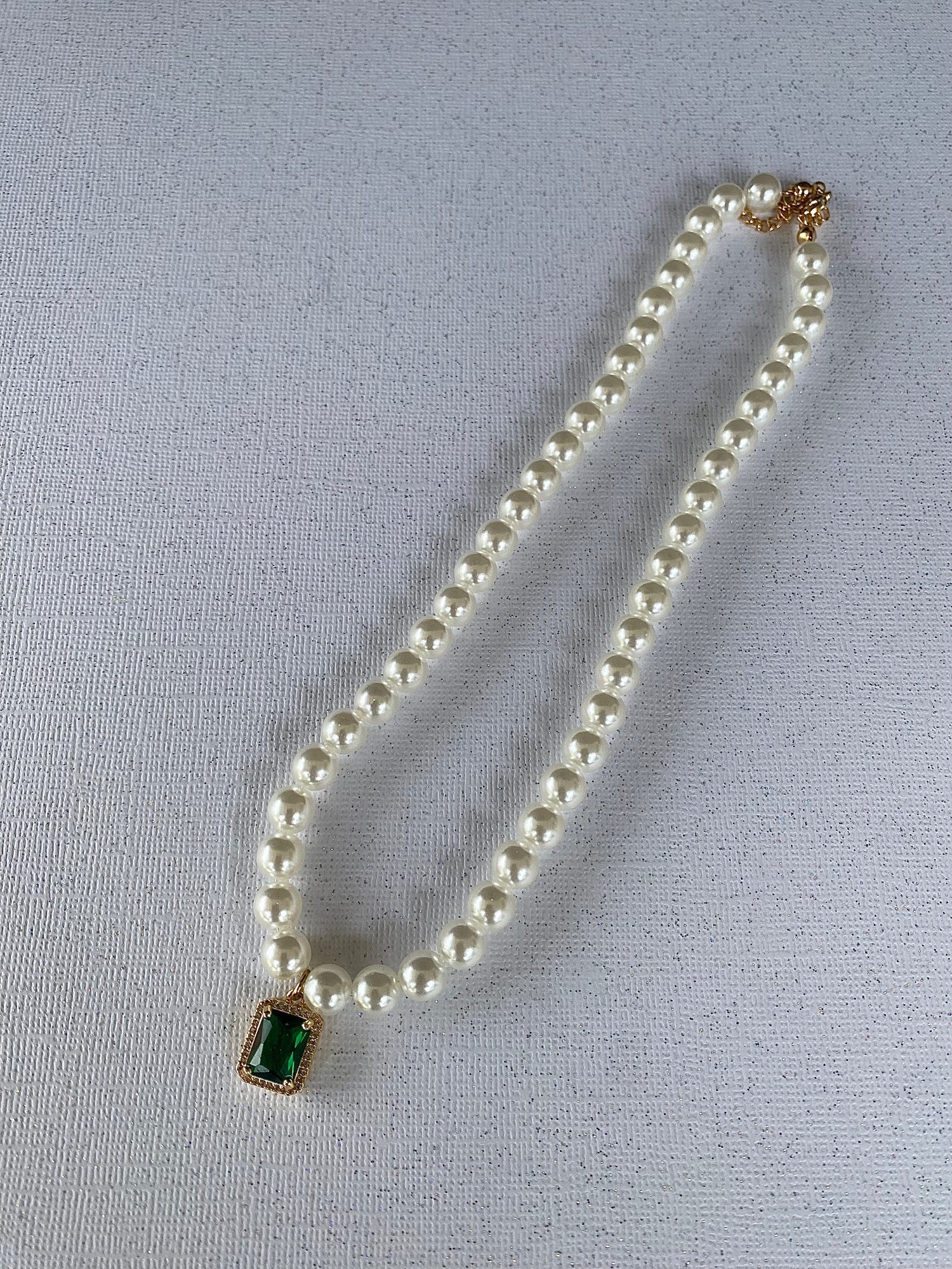 8mm faux pearls with gold, emerald charm. 16 inches long with adjuster.
